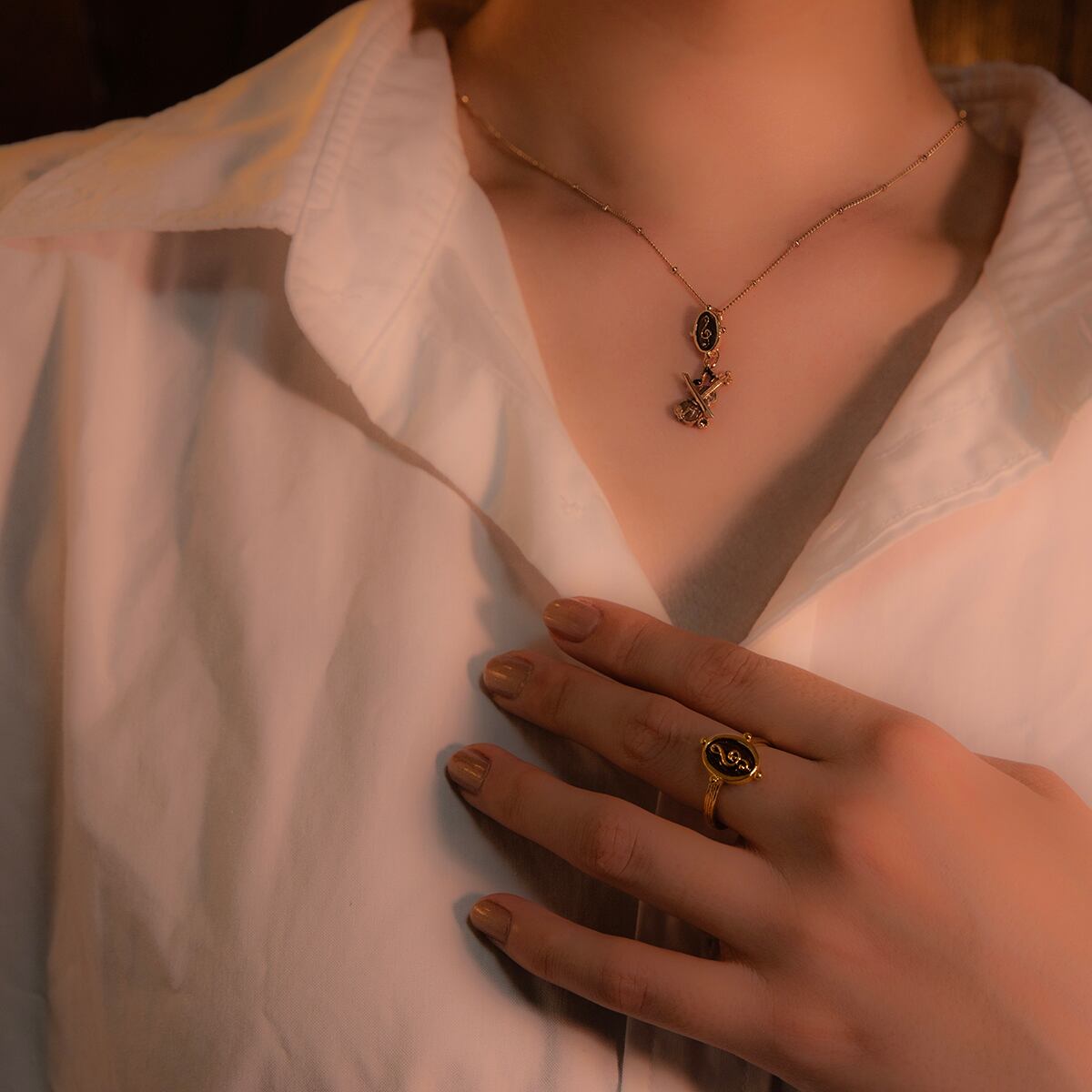 フレームはコーダ記号、指輪のアーム部分は五線譜、そしてその端には楽譜の終止符のような太いラインが施されて作られているという、まさに音楽好きの方におすすめのアクセサリーが登場しました◎