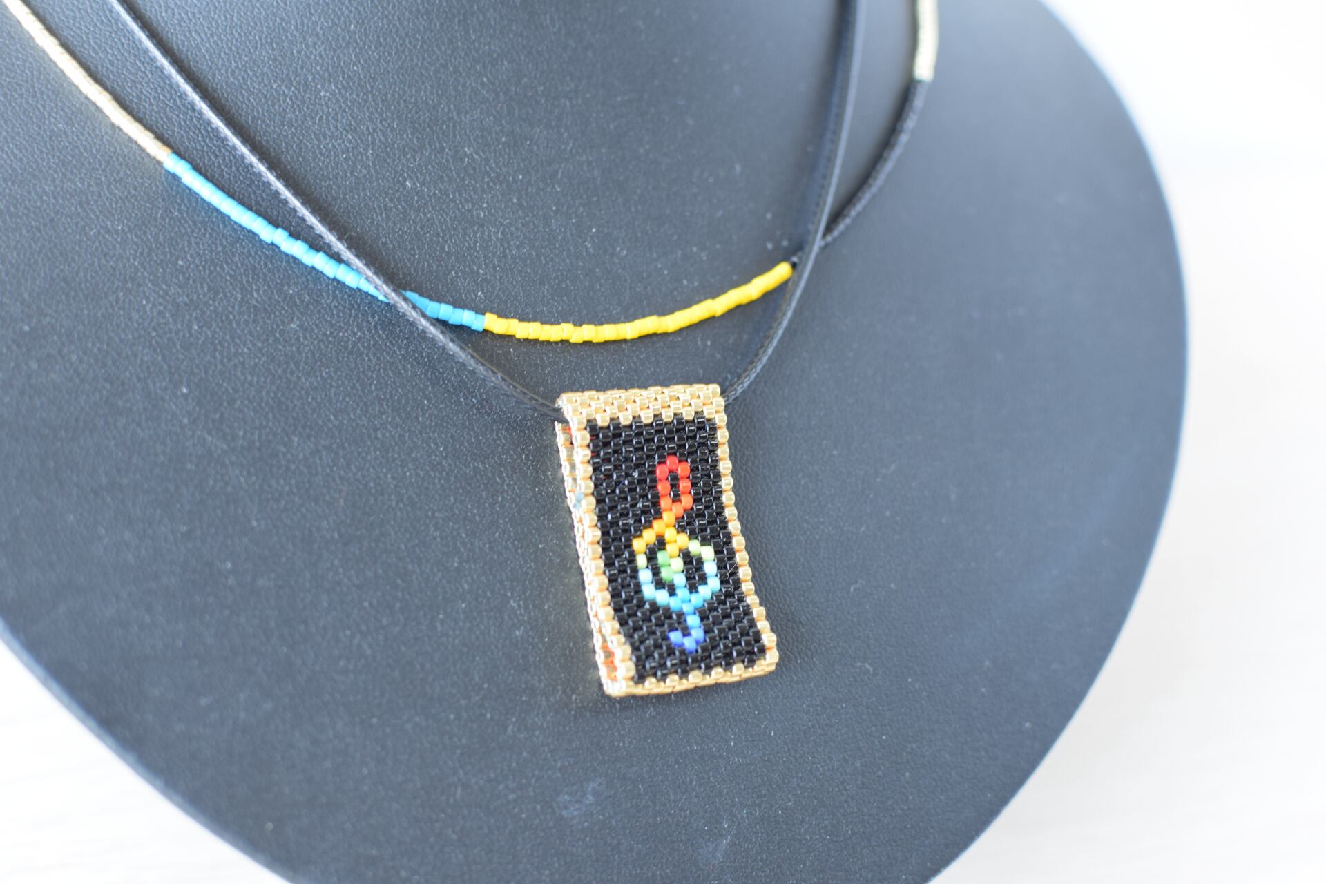 ハンガリー出身のビーズジュエリーデザイナーが製作したト音記号のリバーシブルネックレスです。