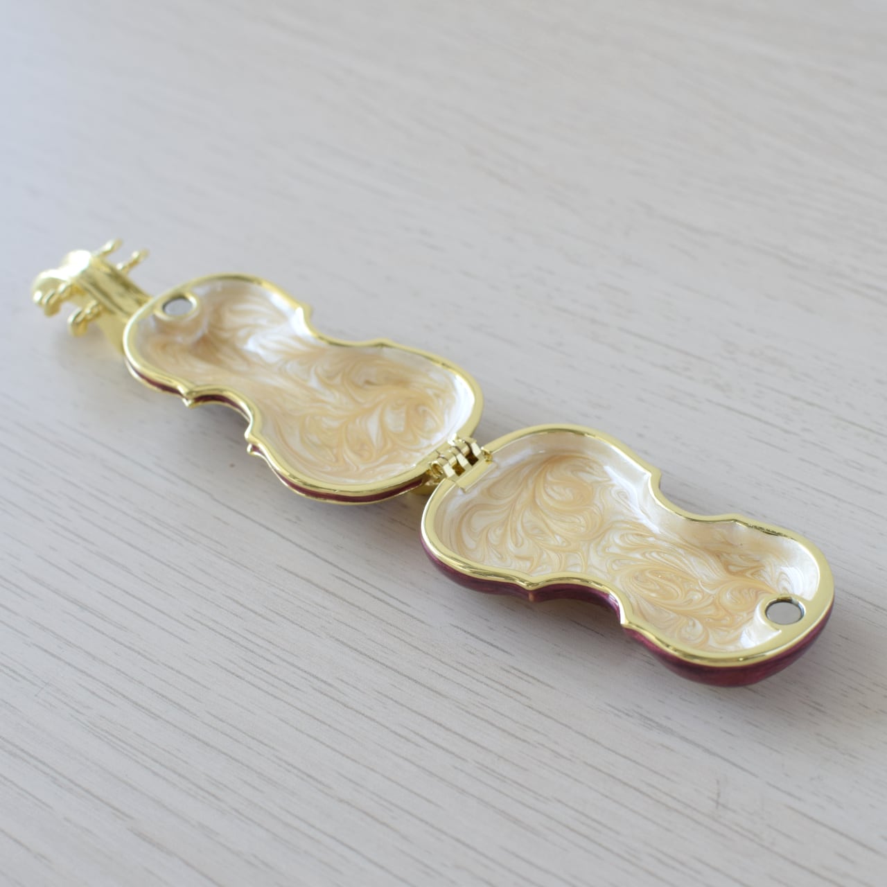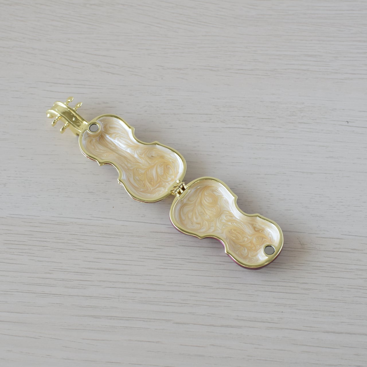 ヴァイオリンの上部からパカッと開閉できる仕組みになっており、マグネットでしっかりと留まりますので大切なジュエリーを安全に収納できます◎