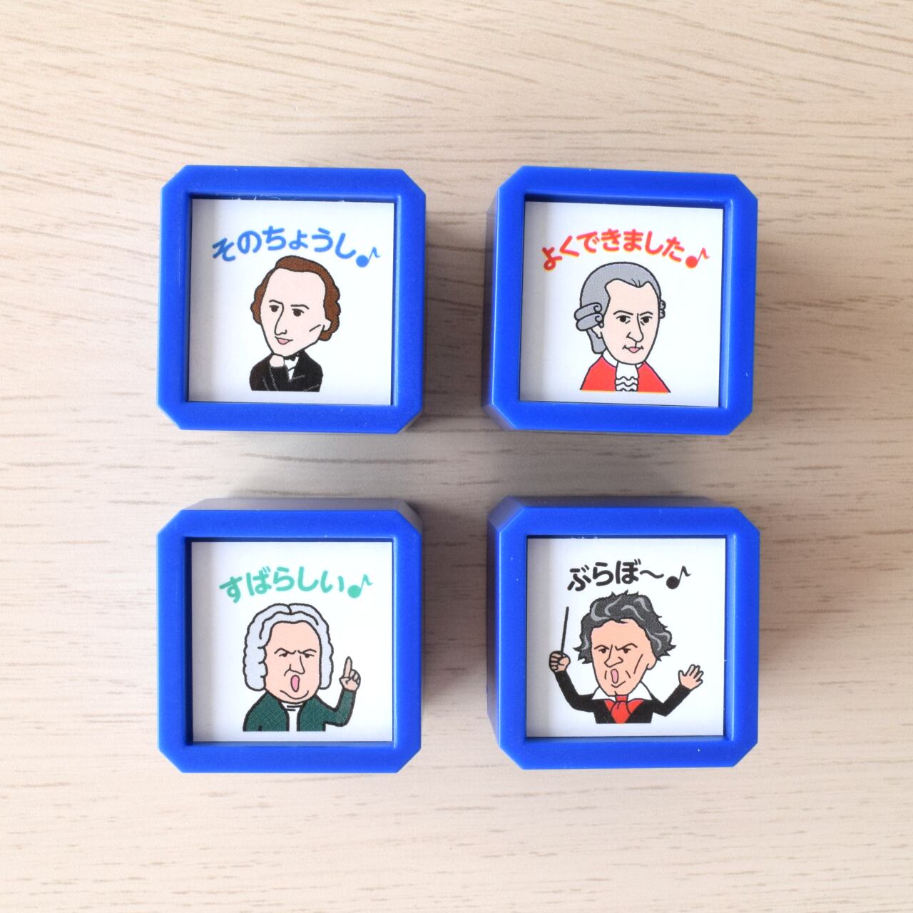 ブラボースタンプはべートーヴェン、モーツァルト、バッハ、ショパンの全4種類、メッセージもそれぞれ違いますのでその時々で使い分けるのもGood!スタンプを重ねて収納も可能です。